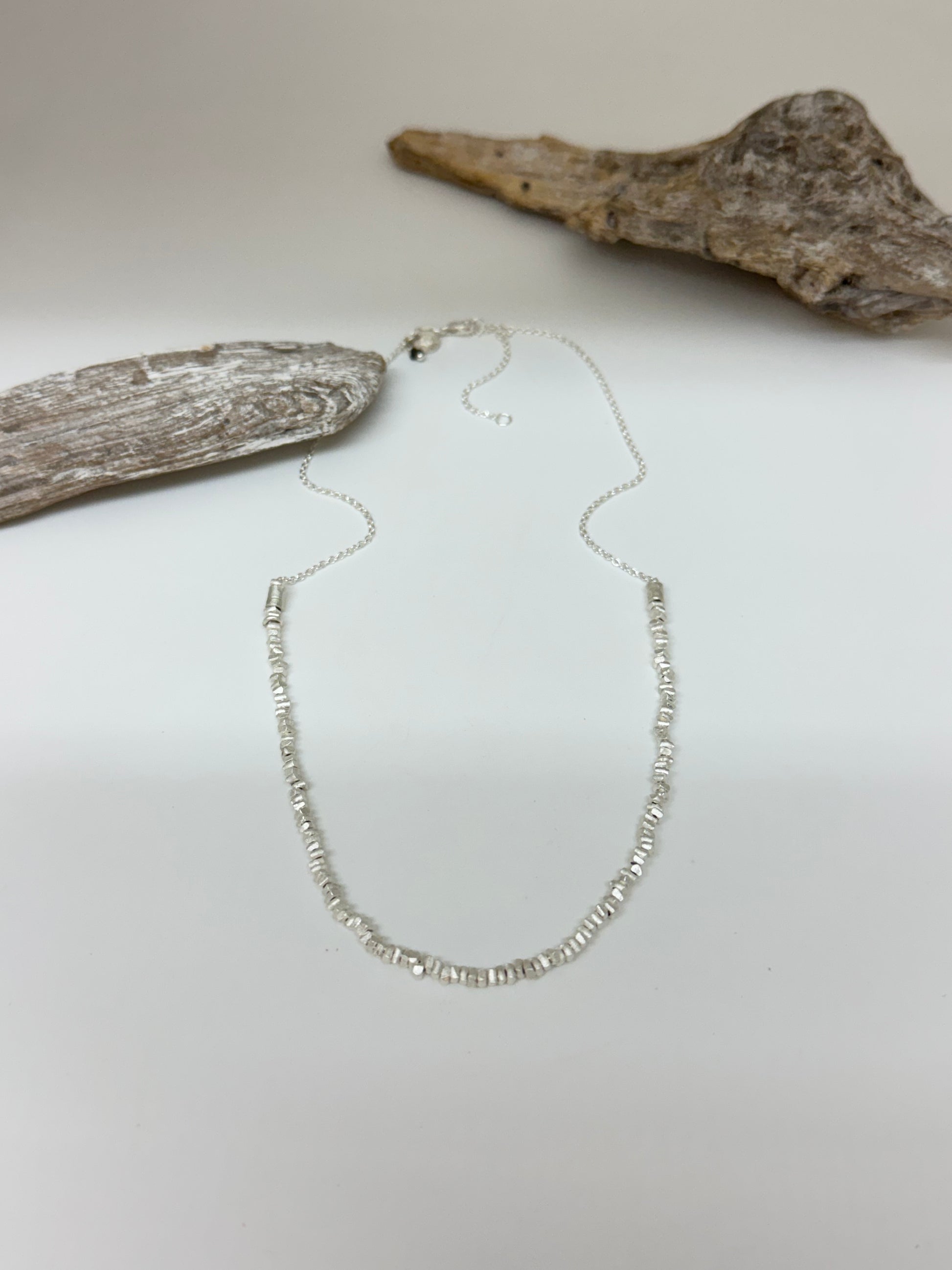 Le collier pépites est composé de petites perles d'argent et d'une chaîne très délicate.