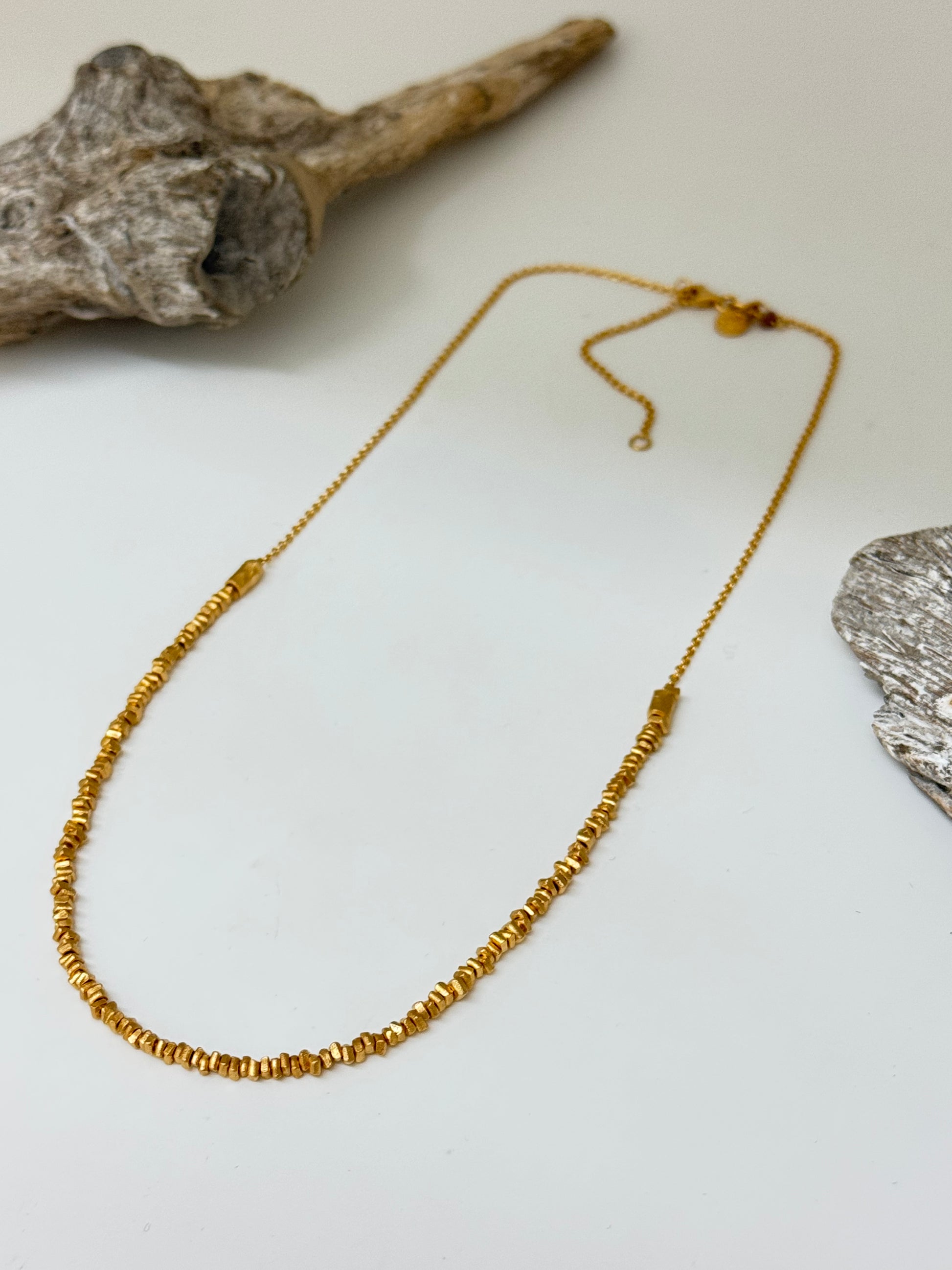 Le collier pépites est composé de petites perles d'or et d'une chaîne très délicate.