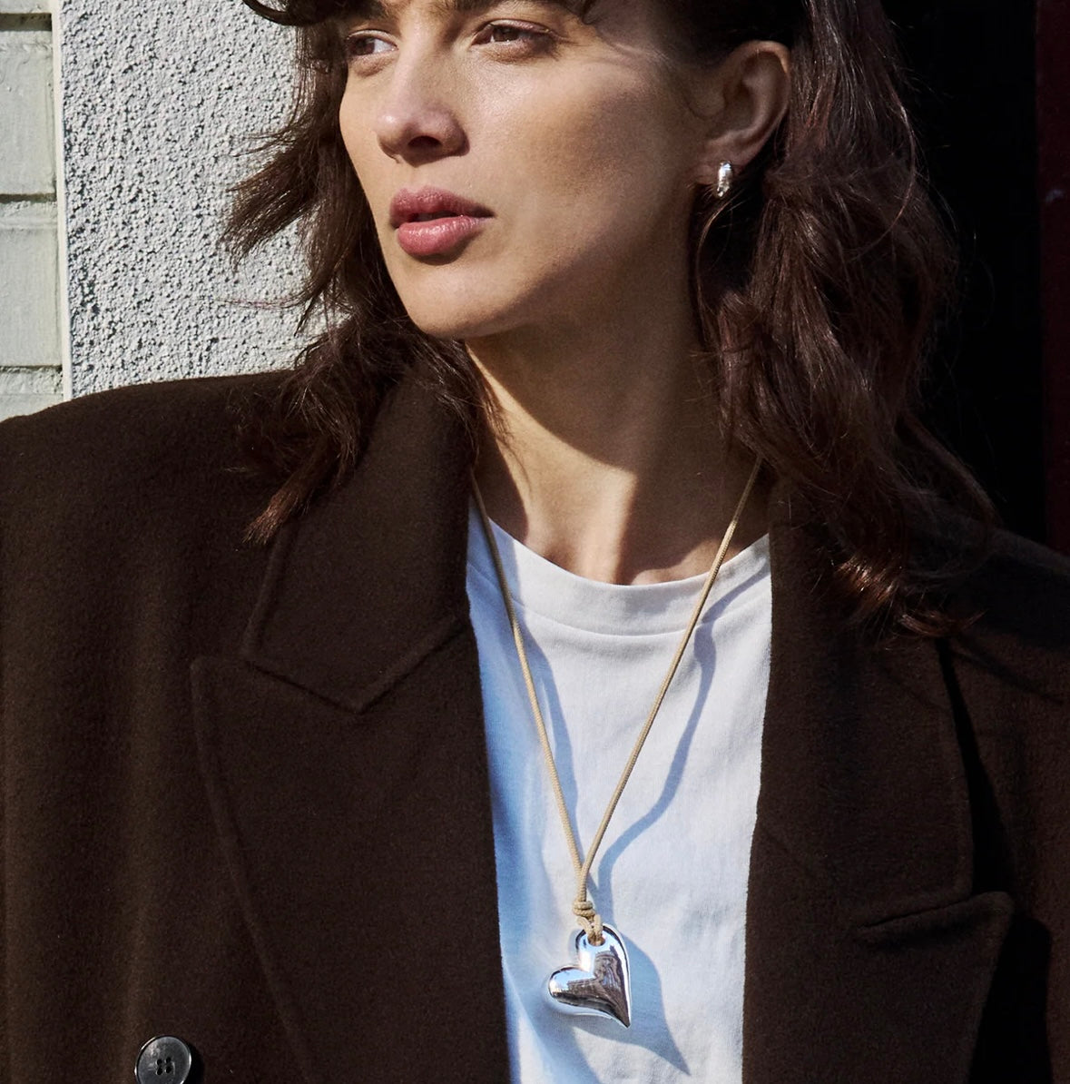 Ce volumineux pendentif en forme de cœur en argent est suspendu à un cordon beige réglable en polyester recyclé. Finition en argent poli.